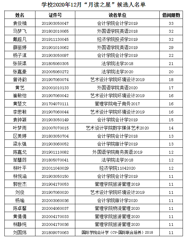 关于公布2020年12月“月读之星”候选人名单的通知