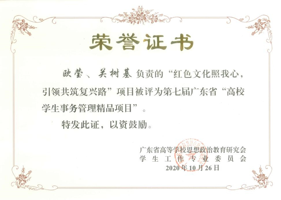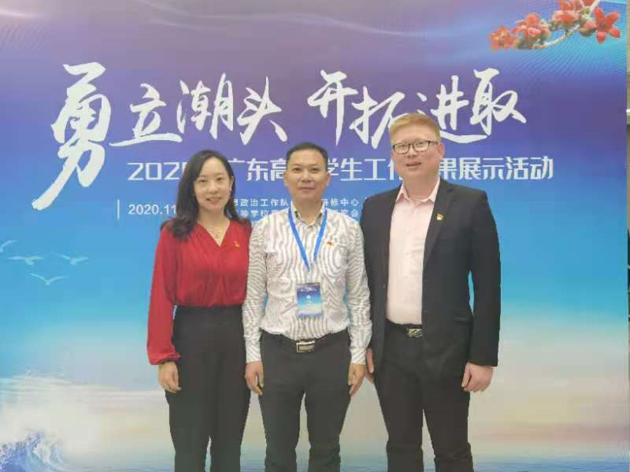 近日,由广东省教育厅主办、教育部高校思想政治工作队伍培训研修中心(华南师范大学)、广东省思想政治工作研究会、广东高校易班发展中心、广东工业大学共同举办的“勇立潮头,开拓进取”2020年广东高校学生工作成果展示活动在广东工业大学大学城校区圆满落幕。我校艺术设计学院欧莹、关树基负责的红色文化教育项目《红色文化照我心,引领共筑复兴路》荣获第七届广东省“高校学生事务管理精品项目”。我校学生工作部部长何柏略、艺术设计学院党总支书记欧莹及骨干辅导员关树基受邀参加颁奖典礼并全程观看了2020年广东省高校学生工作成果展示活动。