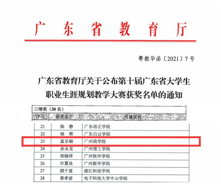 6月1日,广东省教育厅公布了第十届广东省大学生职业生涯规划教学大赛结果,我校就业指导课教研室蓝乐钿老师荣获广东省第十届大学生职业生涯规划教学大赛本科组三等奖。