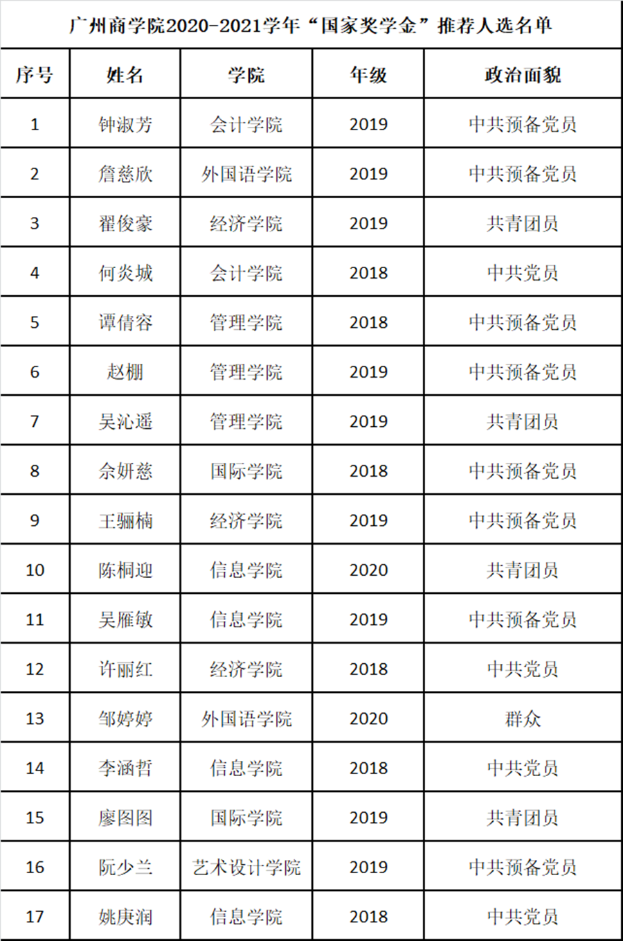 综合前期学生工作处对竞选学生提交已核实材料的量化测评分和现场竞选评分,钟淑芳等17名同学(详细名单附后)最后脱颖而出,成功获得学校2020-2021学年国家奖学金人选推荐资格,作为我校代表到广东省教育厅和国家教育部参评。教育部将在年底公布最终国家奖学金评选结果。