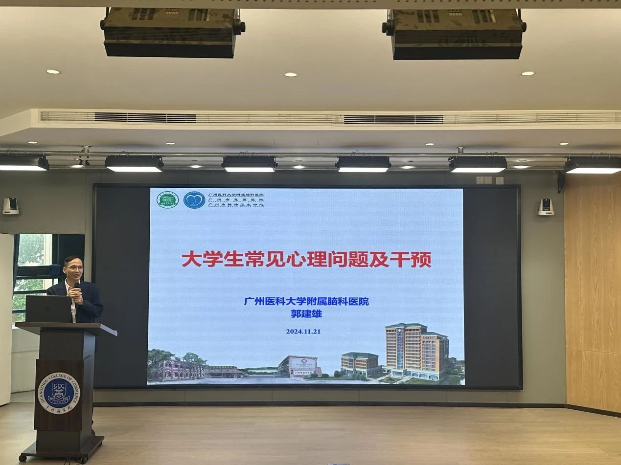 为推动我校心理健康教育工作高质量发展,11月21日上午,我校学生工作处在八教202报告厅举办了大学生常见心理问题与危机干预讲座。讲座在八教203报告厅和第四教学楼第二报告厅分会场同步直播,现场参会人员达300多人。讲座邀请了广州医科大学附属脑科医院中西医结合科主任、硕士导师郭建雄担任主讲人。参会人员包括学生处、团委、心理中心工作人员,二级学院党总支书记、辅导员和班主任,保卫处、后勤管理中心等相关人员。学生处副处长、心理健康教育与咨询中心主任张秋艳主持本次活动。